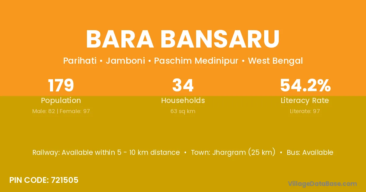 Jhargram (25 km) is the nearest town to Bara Bansaru village for major economic activities and is located approximately 25 km away.
