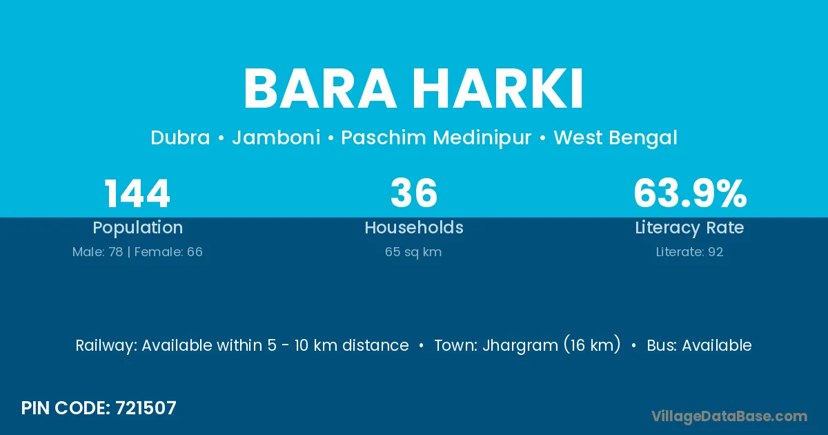 Jhargram (16 km) is the nearest town to Bara Harki village for major economic activities and is located approximately 16 km away.