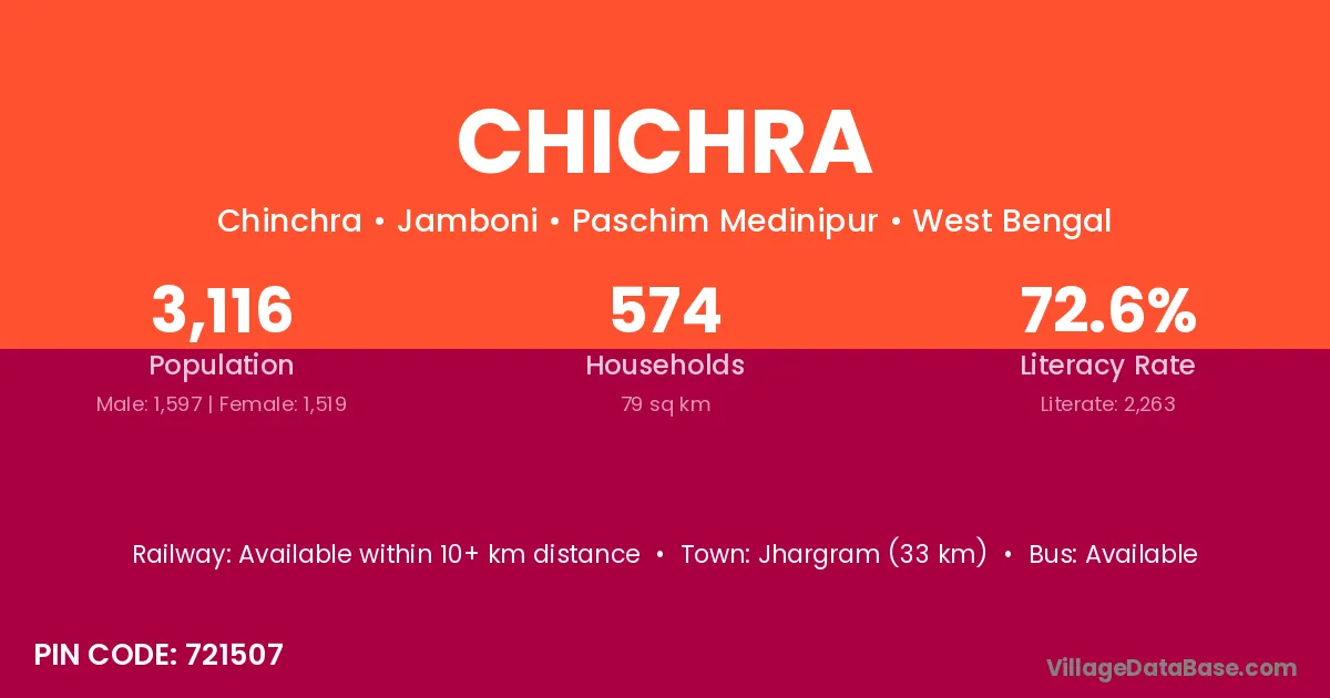 Jhargram (33 km) is the nearest town to Chichra village for major economic activities and is located approximately 33 km away.