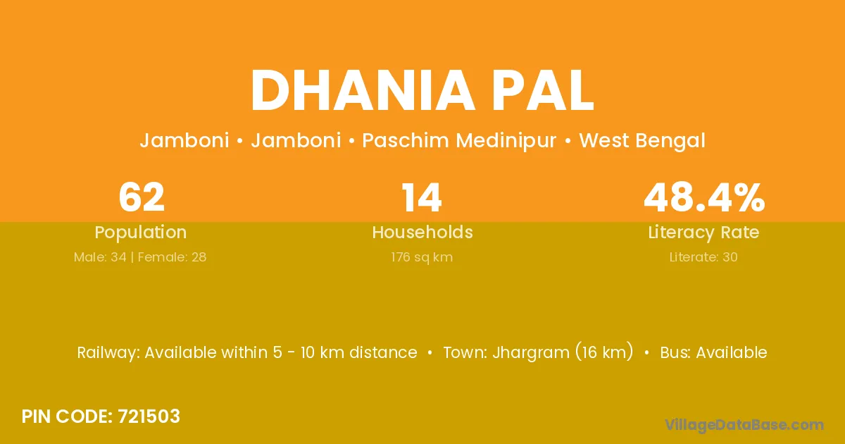 Jhargram (16 km) is the nearest town to Dhania Pal village for major economic activities and is located approximately 16 km away.