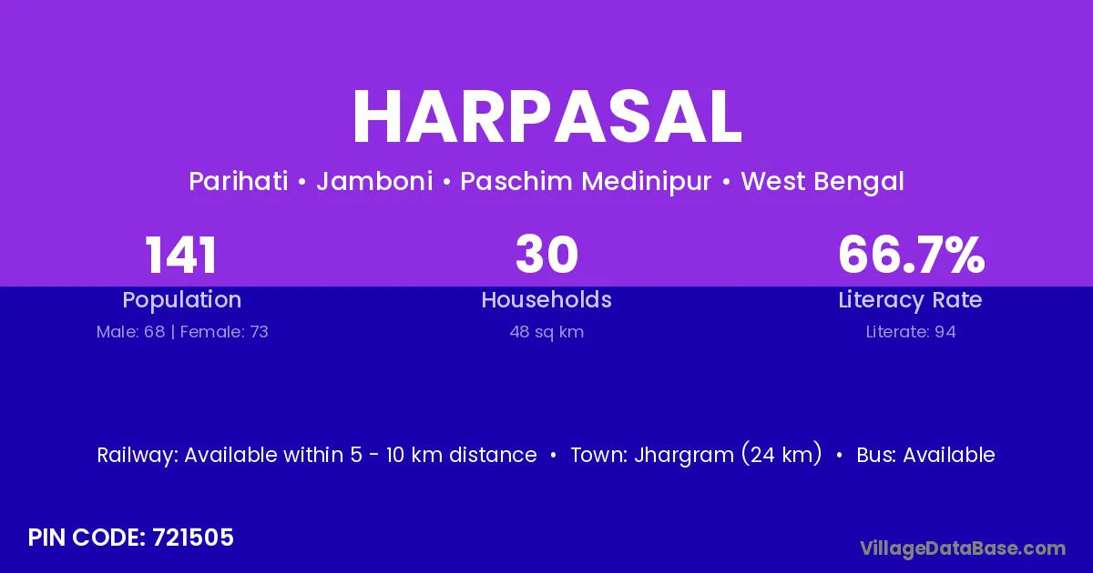 Jhargram (24 km) is the nearest town to Harpasal village for major economic activities and is located approximately 24 km away.