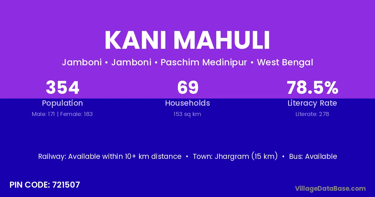 Jhargram (15 km) is the nearest town to Kani Mahuli village for major economic activities and is located approximately 15 km away.
