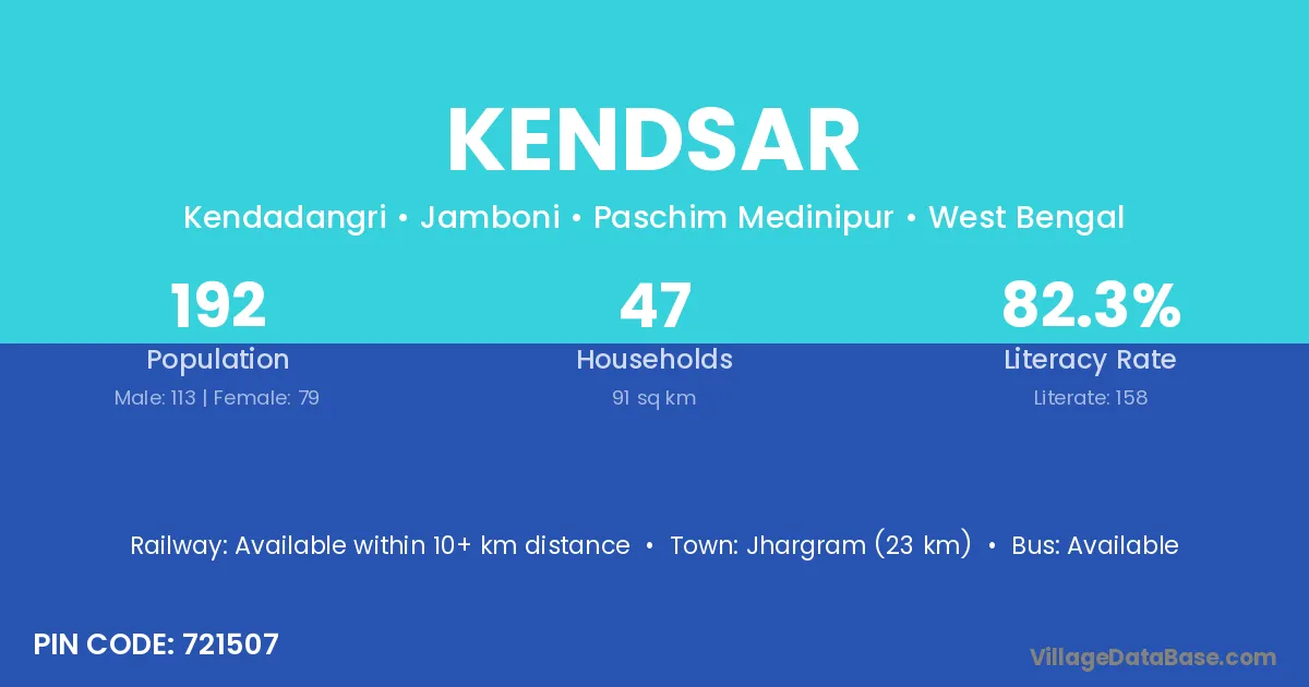 Jhargram (23 km) is the nearest town to Kendsar village for major economic activities and is located approximately 23 km away.