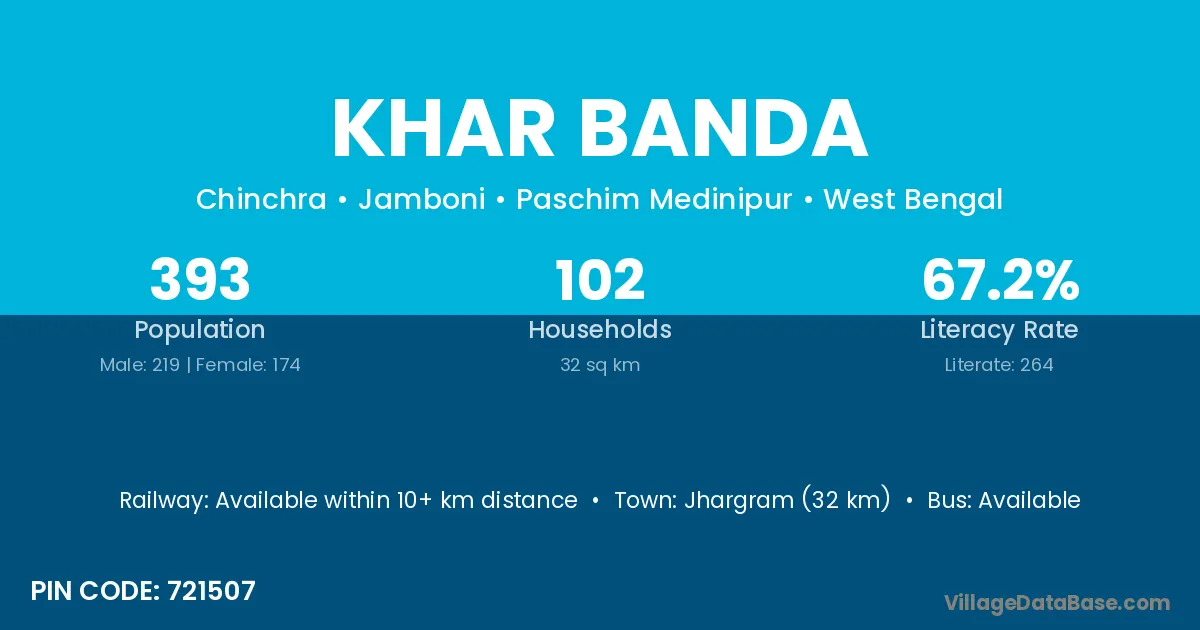 Jhargram (32 km) is the nearest town to Khar Banda village for major economic activities and is located approximately 32 km away.