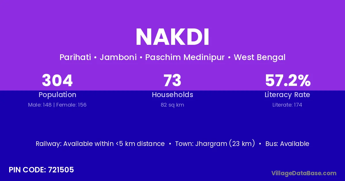 Jhargram (23 km) is the nearest town to Nakdi village for major economic activities and is located approximately 23 km away.