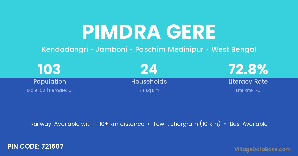 Jhargram (10 km) is the nearest town to Pimdra Gere village for major economic activities and is located approximately 10 km away.