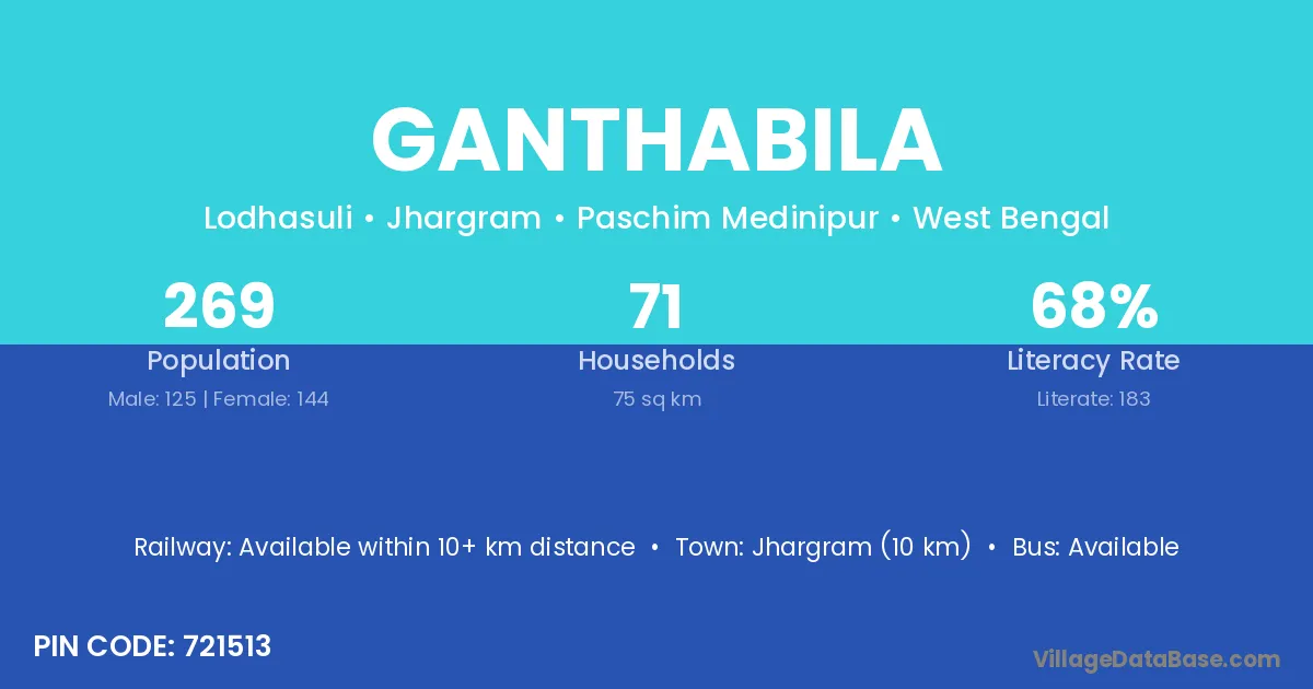 Jhargram (10 km) is the nearest town to Ganthabila village for major economic activities and is located approximately 10 km away.