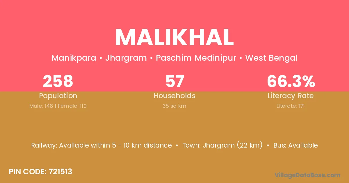 Jhargram (22 km) is the nearest town to Malikhal village for major economic activities and is located approximately 22 km away.