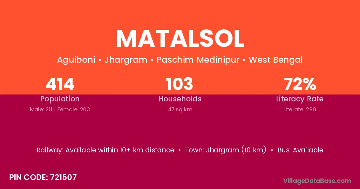 Jhargram (10 km) is the nearest town to Matalsol village for major economic activities and is located approximately 10 km away.