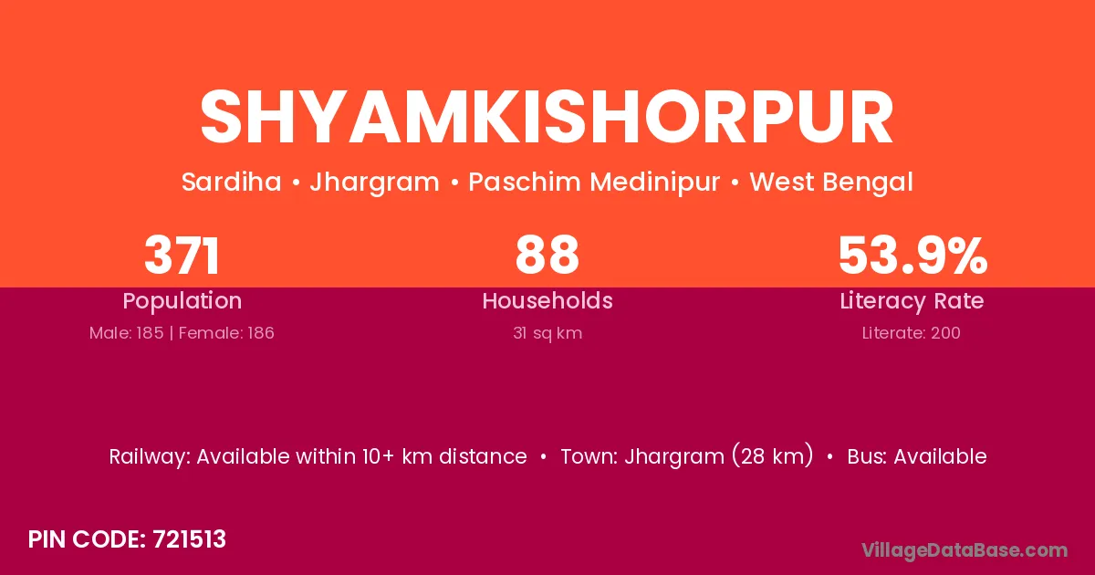 Jhargram (28 km) is the nearest town to Shyamkishorpur village for major economic activities and is located approximately 28 km away.