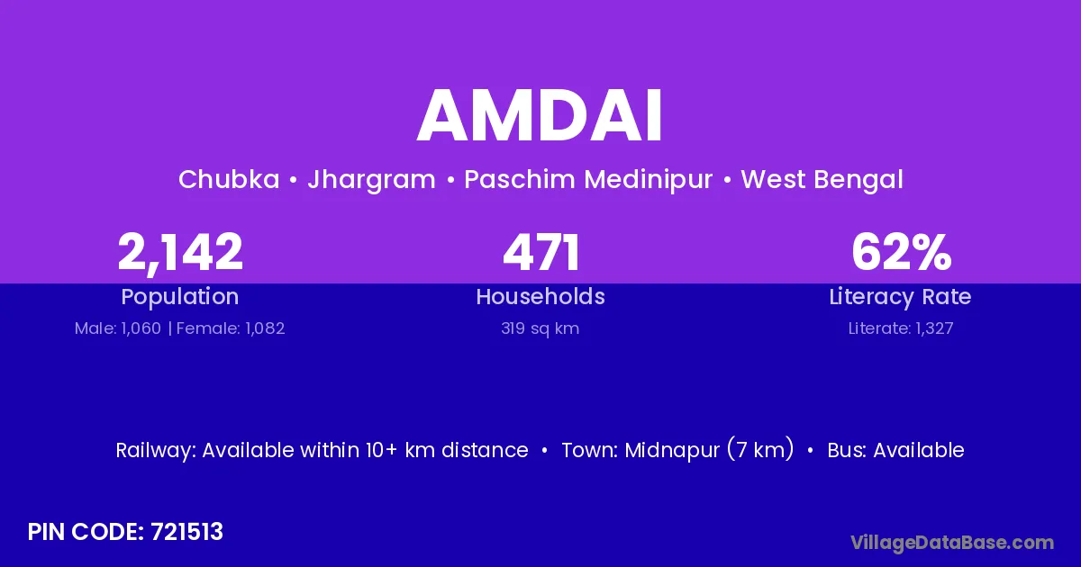 Midnapur (7 km) is the nearest town to Amdai village for major economic activities and is located approximately 7 km away.