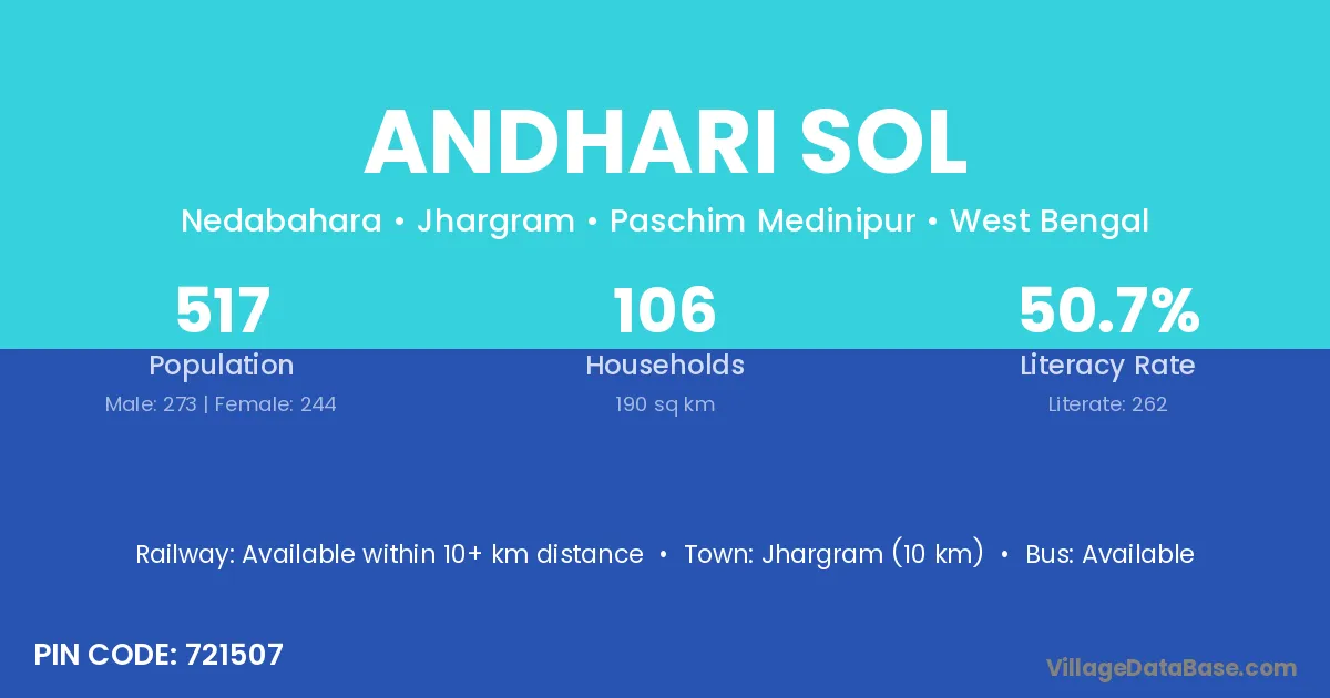 Jhargram (10 km) is the nearest town to Andhari Sol village for major economic activities and is located approximately 10 km away.