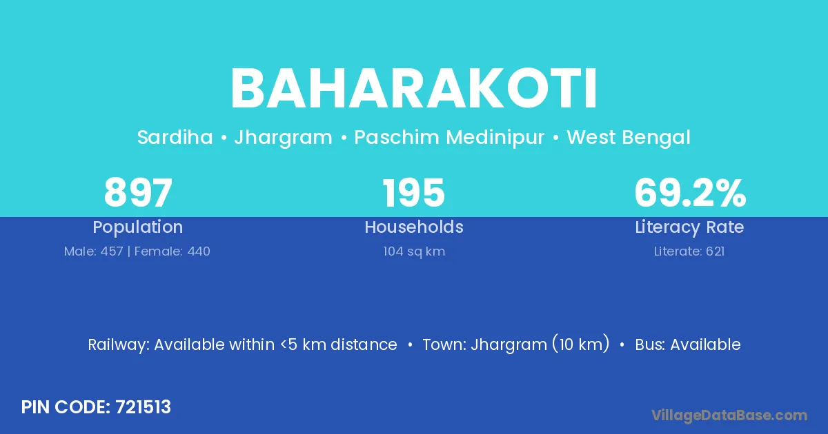 Jhargram (10 km) is the nearest town to Baharakoti village for major economic activities and is located approximately 10 km away.