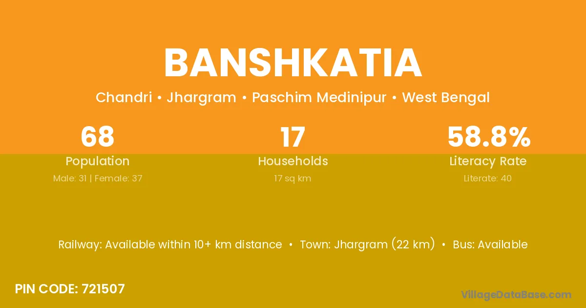 Jhargram (22 km) is the nearest town to Banshkatia village for major economic activities and is located approximately 22 km away.