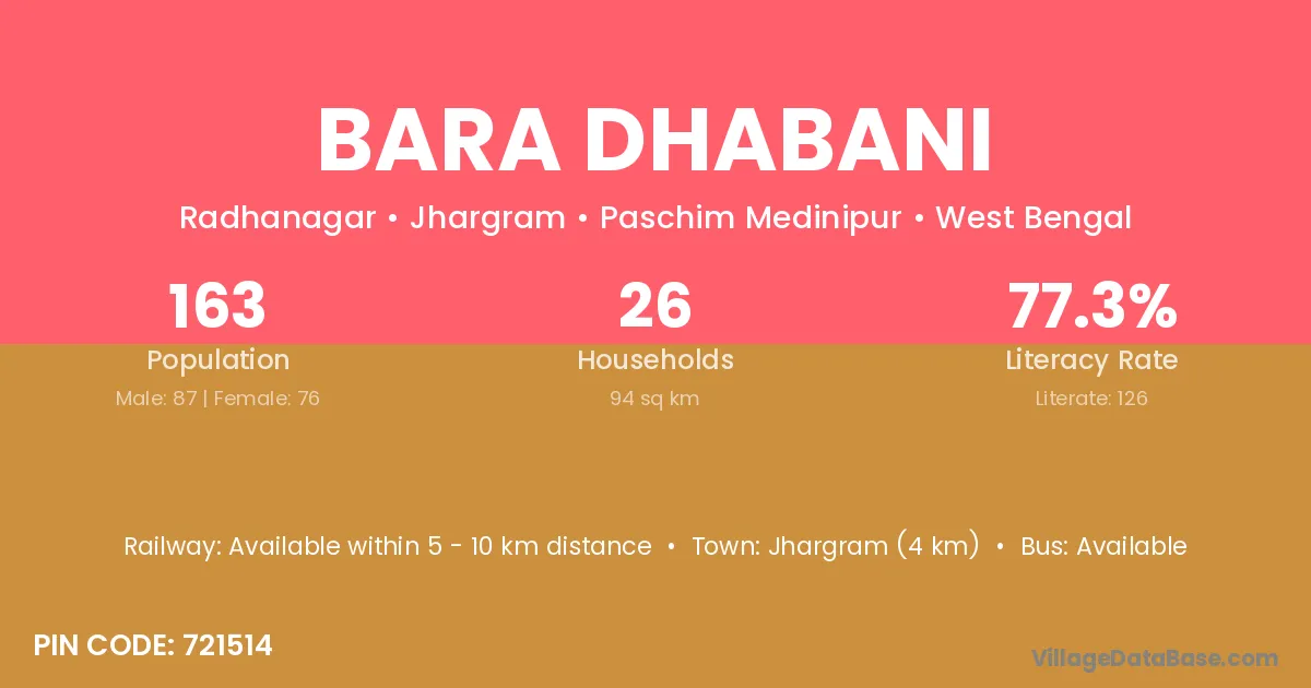 Jhargram (4 km) is the nearest town to Bara Dhabani village for major economic activities and is located approximately 4 km away.