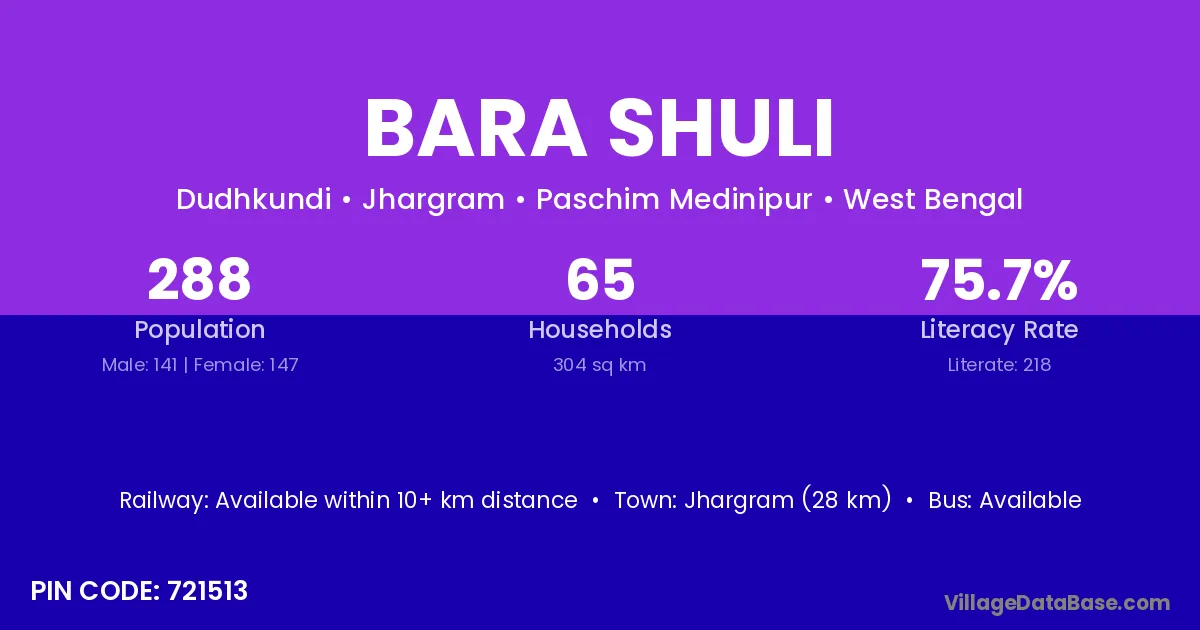 Jhargram (28 km) is the nearest town to Bara Shuli village for major economic activities and is located approximately 28 km away.
