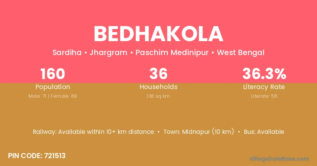 Bedhakola village is located in the Jhargram Subdivision of the Paschim Medinipur district in West Bengal.