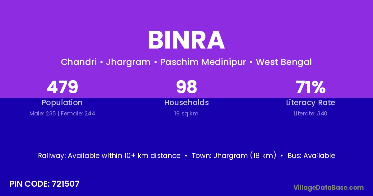 Jhargram (18 km) is the nearest town to Binra village for major economic activities and is located approximately 18 km away.