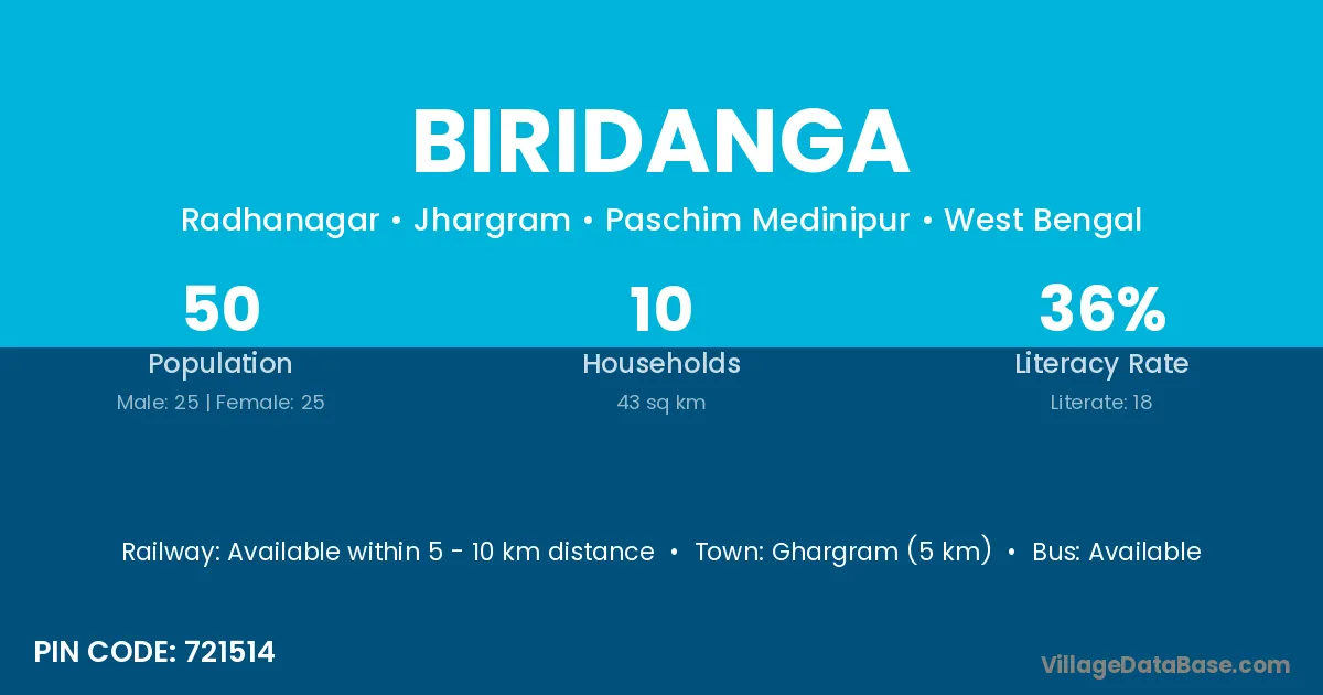 Ghargram (5 km) is the nearest town to Biridanga village for major economic activities and is located approximately 5 km away.