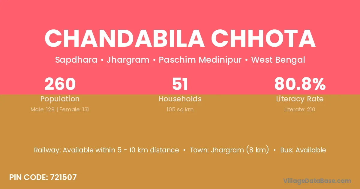 Jhargram (8 km) is the nearest town to Chandabila Chhota village for major economic activities and is located approximately 8 km away.