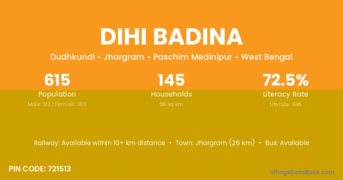 Jhargram (26 km) is the nearest town to Dihi Badina village for major economic activities and is located approximately 26 km away.