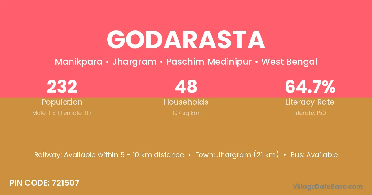 Jhargram (21 km) is the nearest town to Godarasta village for major economic activities and is located approximately 21 km away.