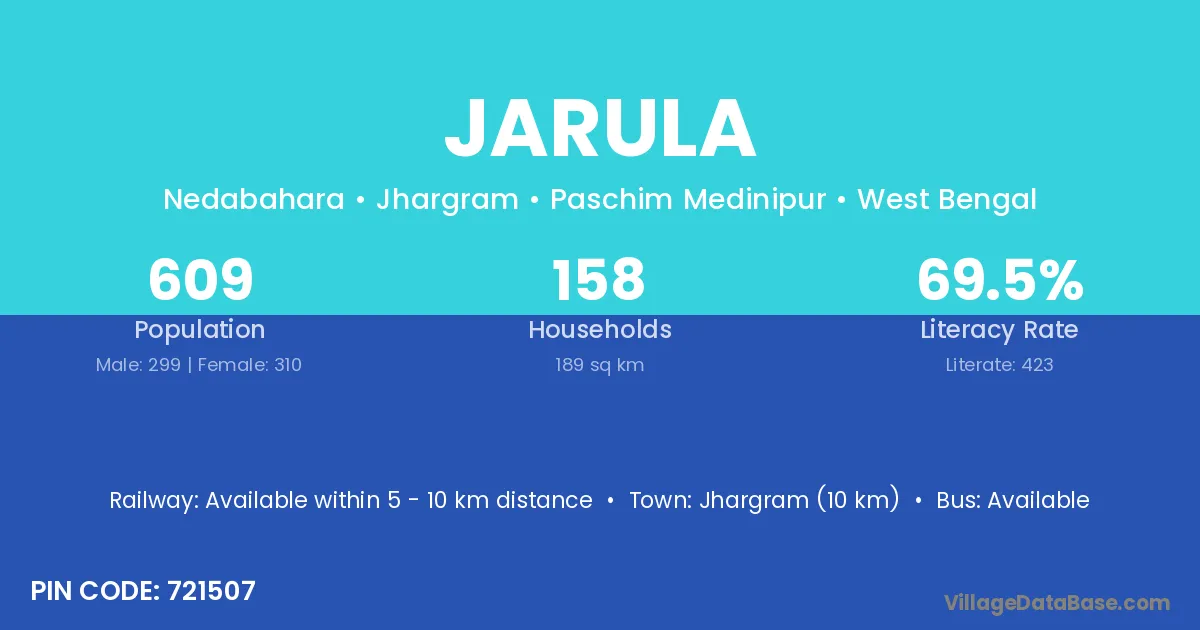 Jhargram (10 km) is the nearest town to Jarula village for major economic activities and is located approximately 10 km away.