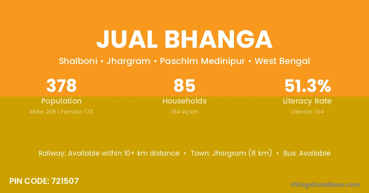Jhargram (8 km) is the nearest town to Jual Bhanga village for major economic activities and is located approximately 8 km away.