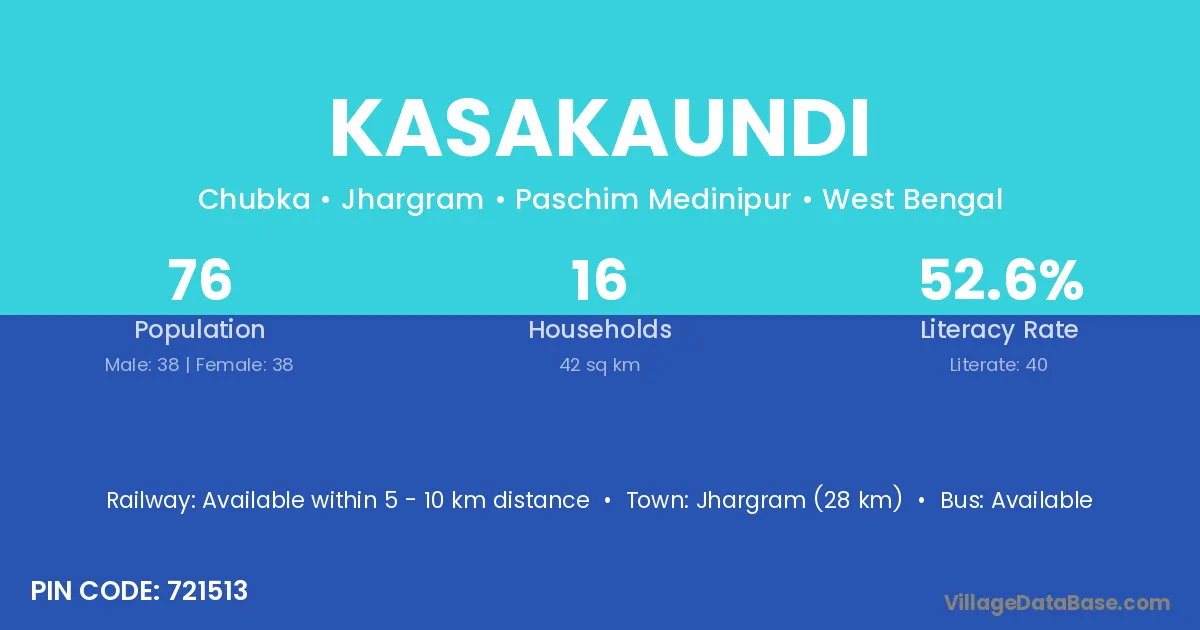 Jhargram (28 km) is the nearest town to Kasakaundi village for major economic activities and is located approximately 28 km away.