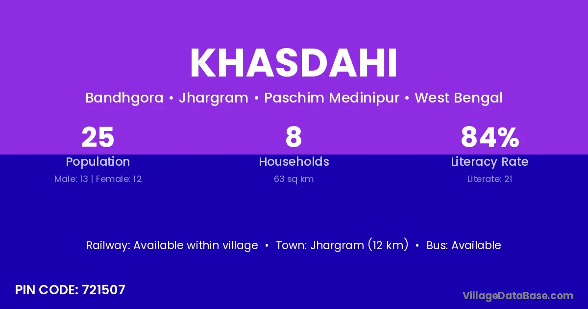Jhargram (12 km) is the nearest town to Khasdahi village for major economic activities and is located approximately 12 km away.