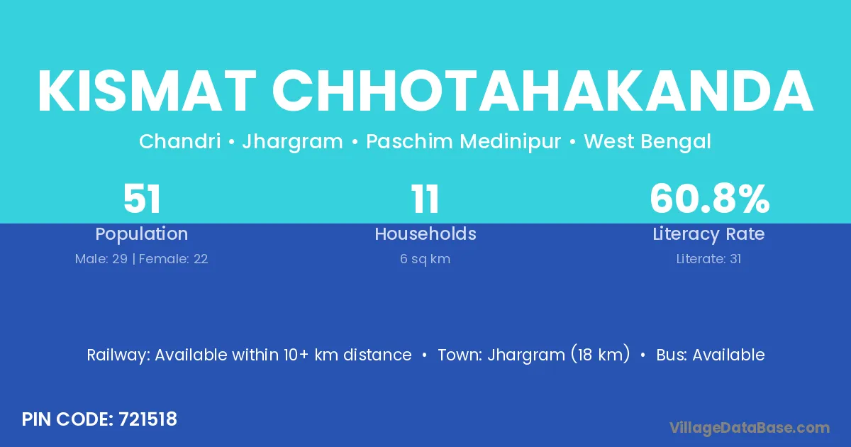 Jhargram (18 km) is the nearest town to Kismat Chhotahakanda village for major economic activities and is located approximately 18 km away.