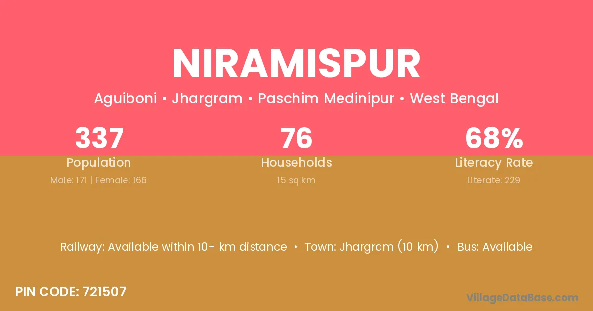 Jhargram (10 km) is the nearest town to Niramispur village for major economic activities and is located approximately 10 km away.