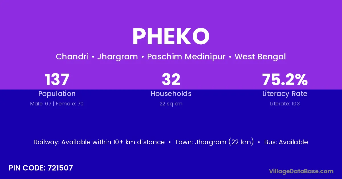 Jhargram (22 km) is the nearest town to Pheko village for major economic activities and is located approximately 22 km away.