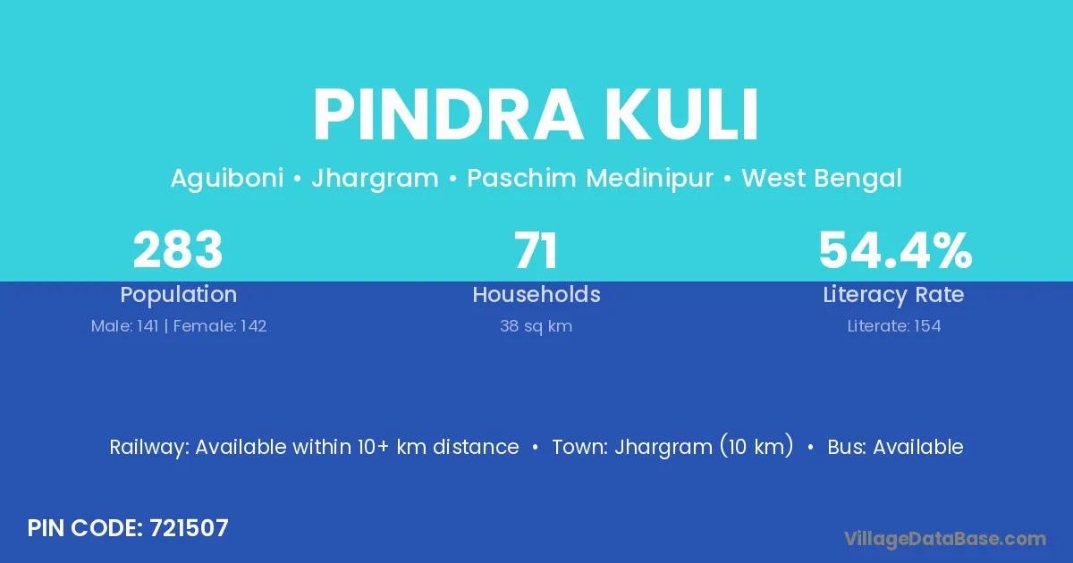 Jhargram (10 km) is the nearest town to Pindra Kuli village for major economic activities and is located approximately 10 km away.