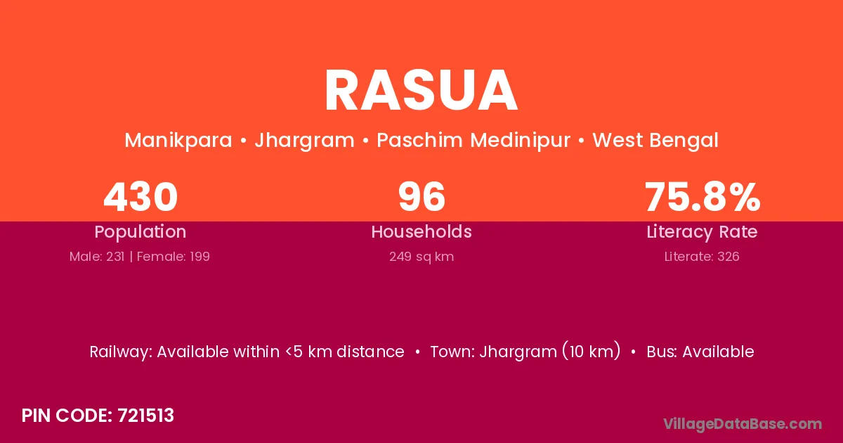 Jhargram (10 km) is the nearest town to Rasua village for major economic activities and is located approximately 10 km away.