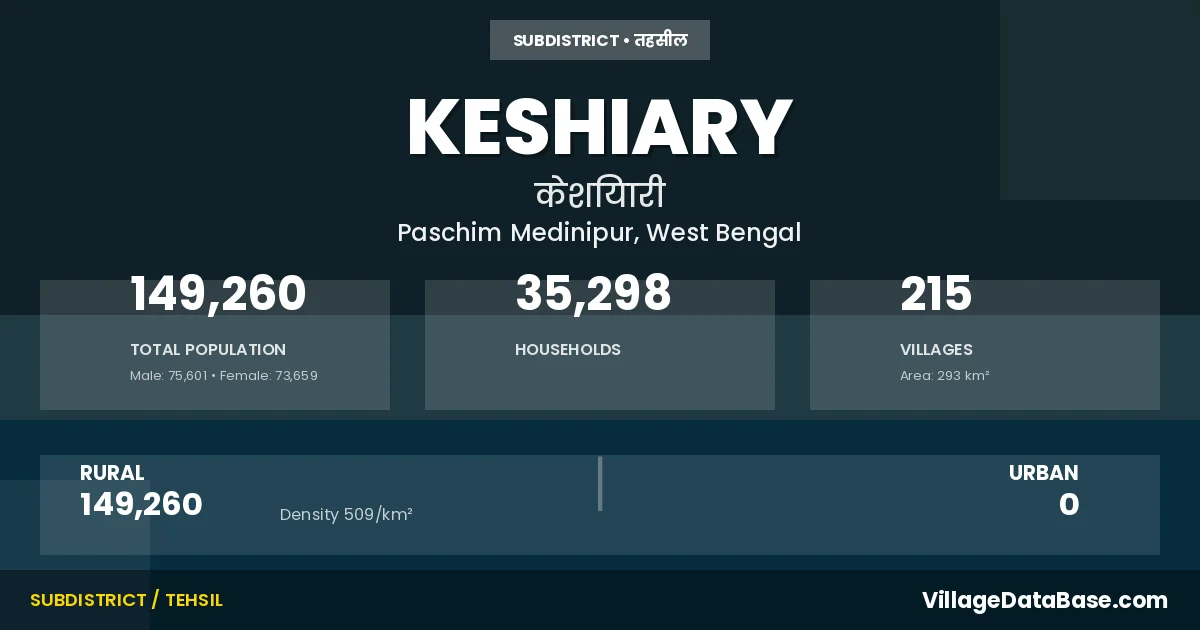 According to the 2011 census The total area of Keshiary Subdivision is 293 km², with a population of 149260 people. The population density is 509 inhabitants per square kilometre, and there are approximately 35298 houses in the sub district.