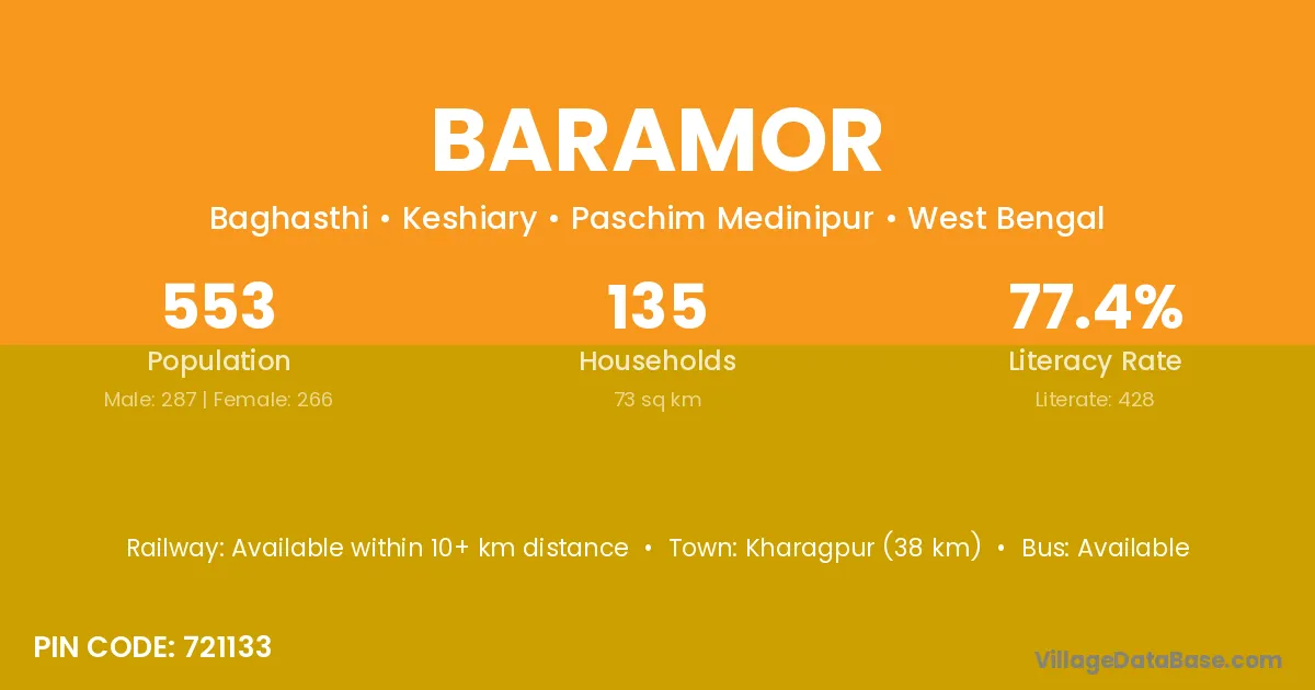 Kharagpur (38 km) is the nearest town to Baramor village for major economic activities and is located approximately 38 km away.
