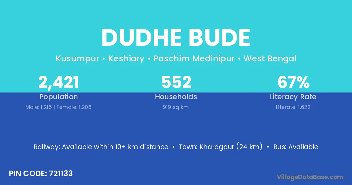 Kharagpur (24 km) is the nearest town to Dudhe Bude village for major economic activities and is located approximately 24 km away.