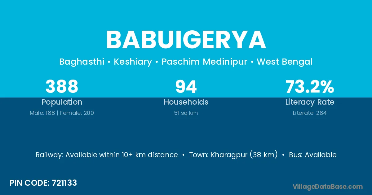 Kharagpur (38 km) is the nearest town to Babuigerya village for major economic activities and is located approximately 38 km away.