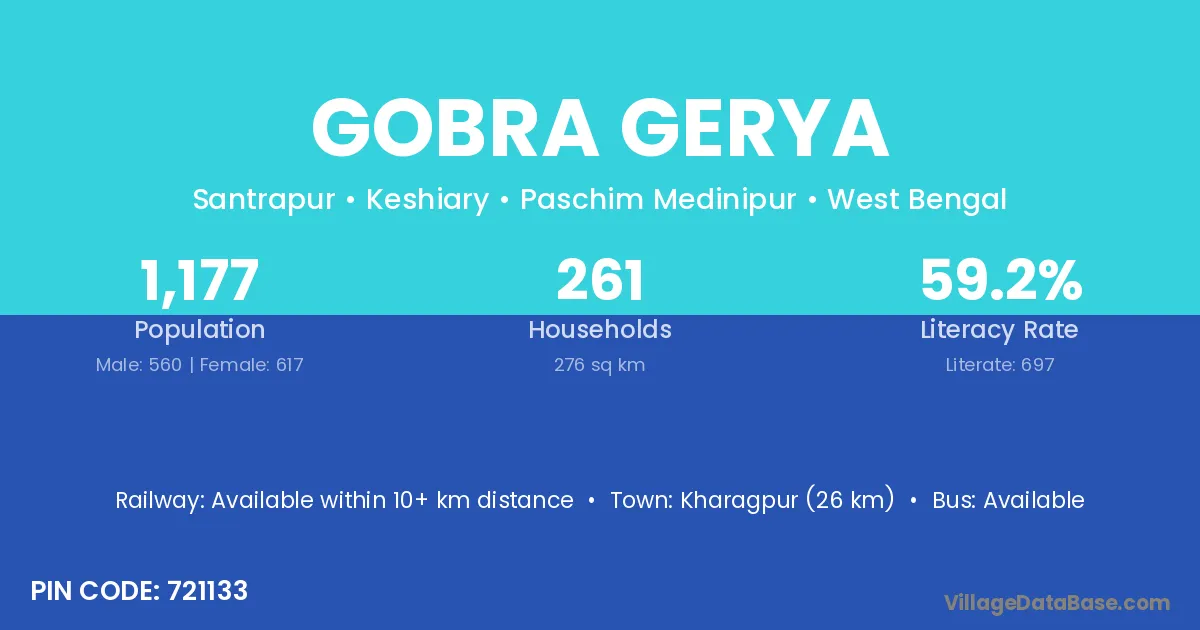 Kharagpur (26 km) is the nearest town to Gobra Gerya village for major economic activities and is located approximately 26 km away.