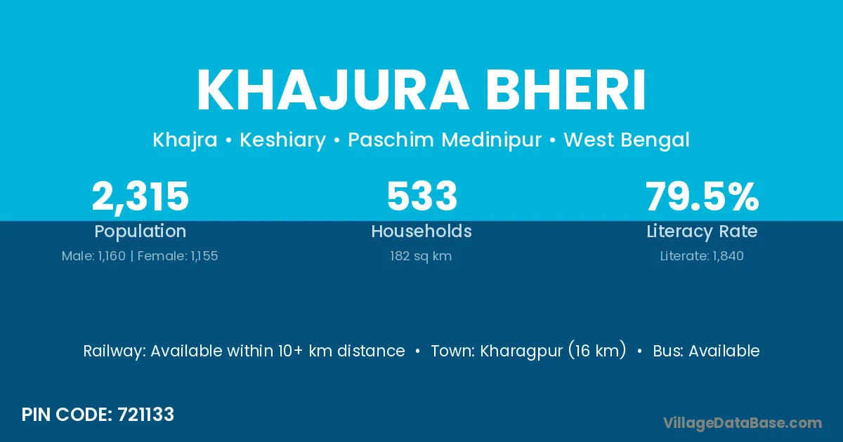 Kharagpur (16 km) is the nearest town to Khajura Bheri village for major economic activities and is located approximately 16 km away.