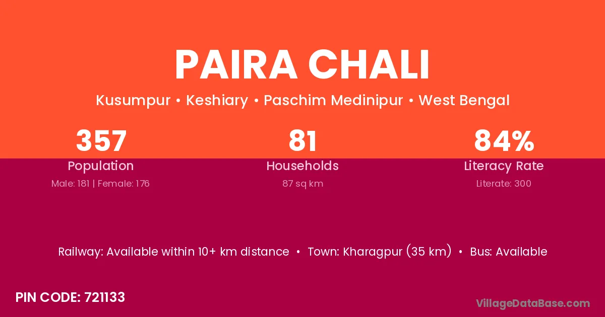 Kharagpur (35 km) is the nearest town to Paira Chali village for major economic activities and is located approximately 35 km away.