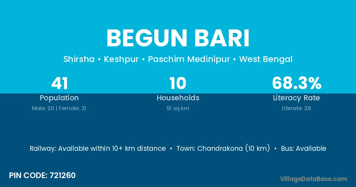 Chandrakona (10 km) is the nearest town to Begun Bari village for major economic activities and is located approximately 10 km away.