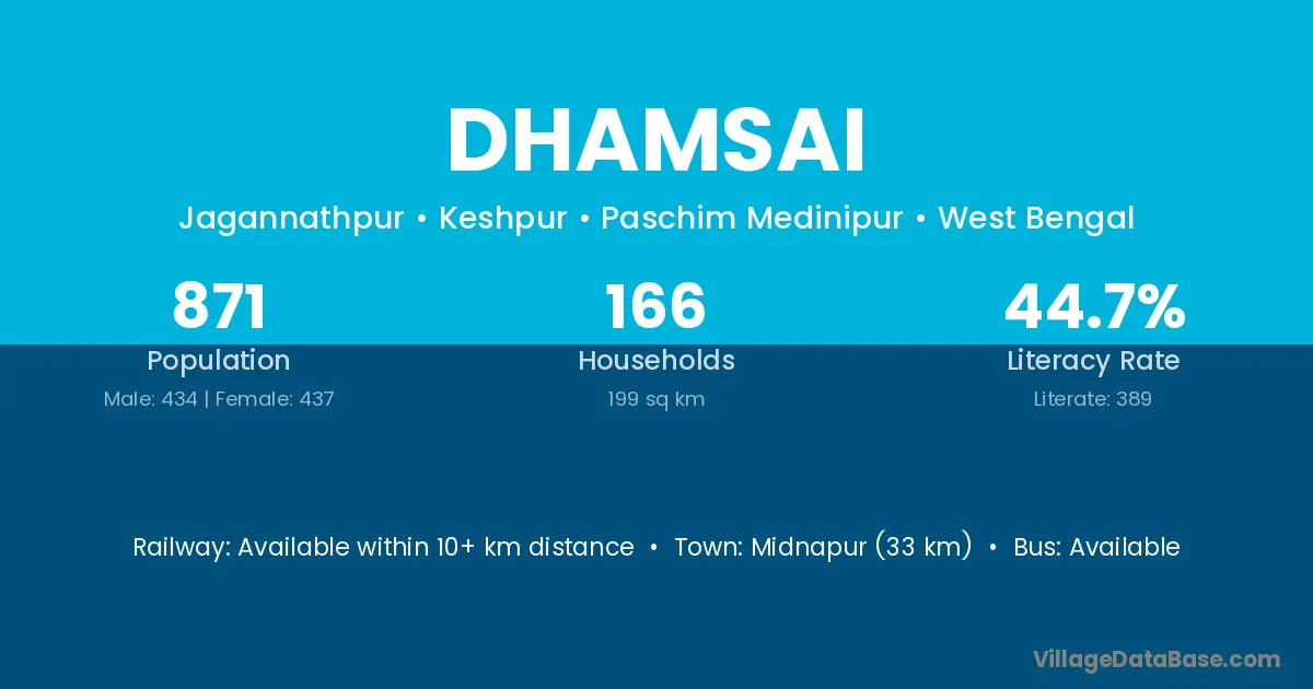 Midnapur (33 km) is the nearest town to Dhamsai village for major economic activities and is located approximately 33 km away.