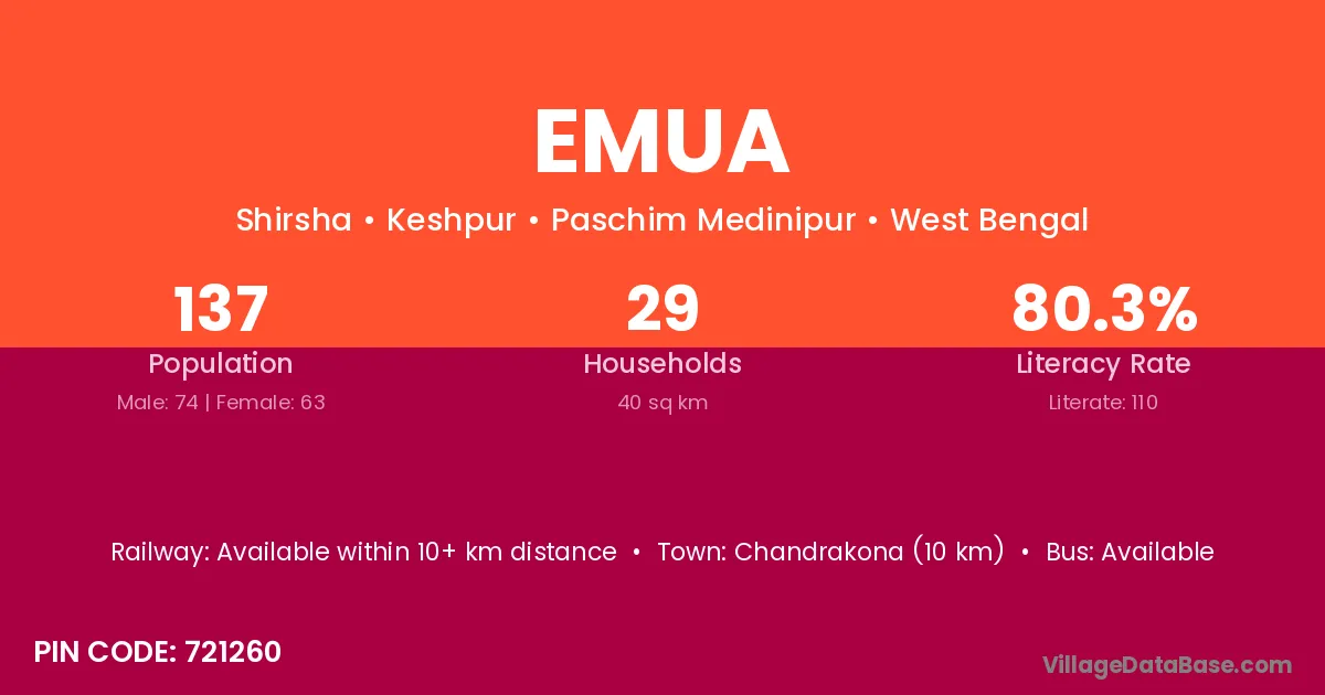 Chandrakona (10 km) is the nearest town to Emua village for major economic activities and is located approximately 10 km away.