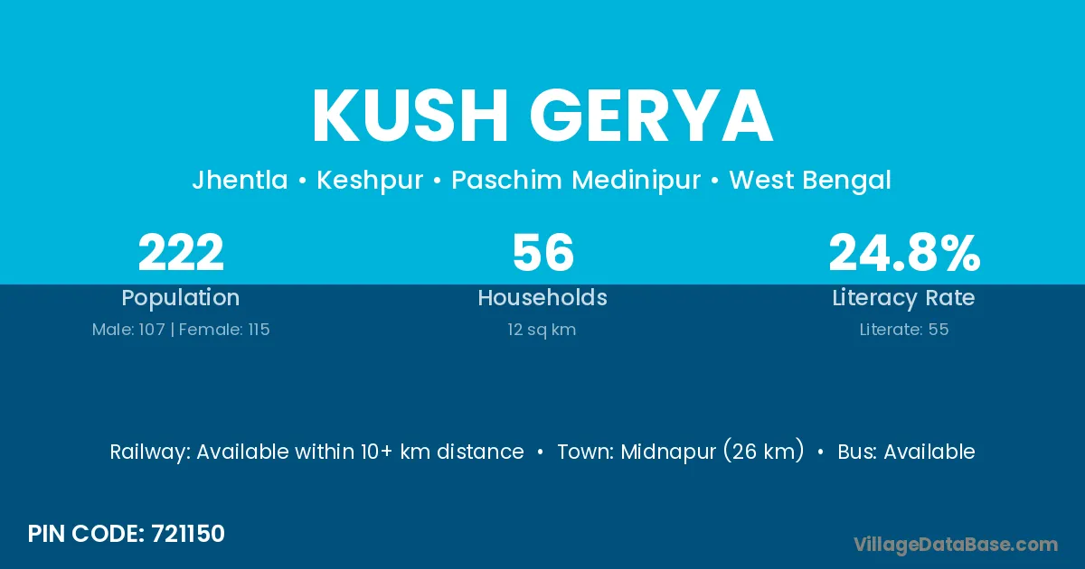 Midnapur (26 km) is the nearest town to Kush Gerya village for major economic activities and is located approximately 26 km away.