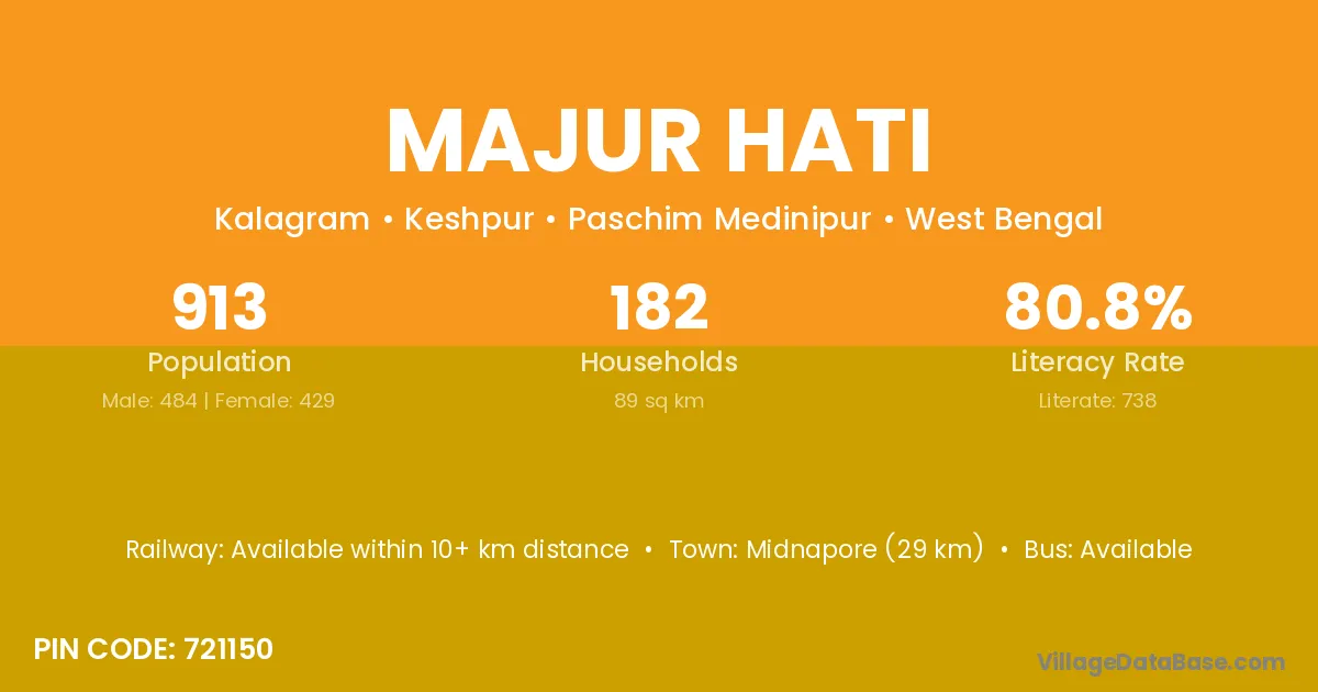 Midnapore (29 km) is the nearest town to Majur Hati village for major economic activities and is located approximately 29 km away.