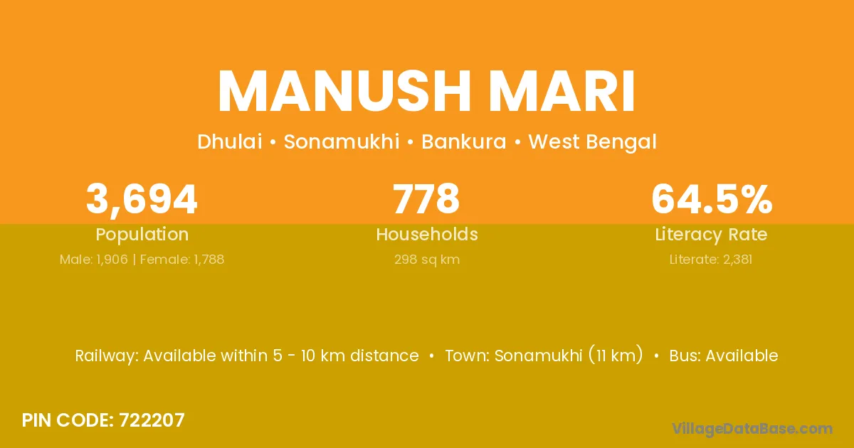 Midnapur (35 km) is the nearest town to Manush Mari village for major economic activities and is located approximately 35 km away.