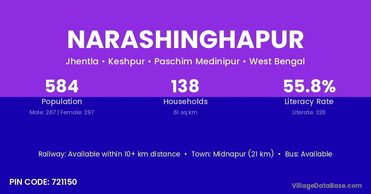 Midnapur (21 km) is the nearest town to Narashinghapur village for major economic activities and is located approximately 21 km away.
