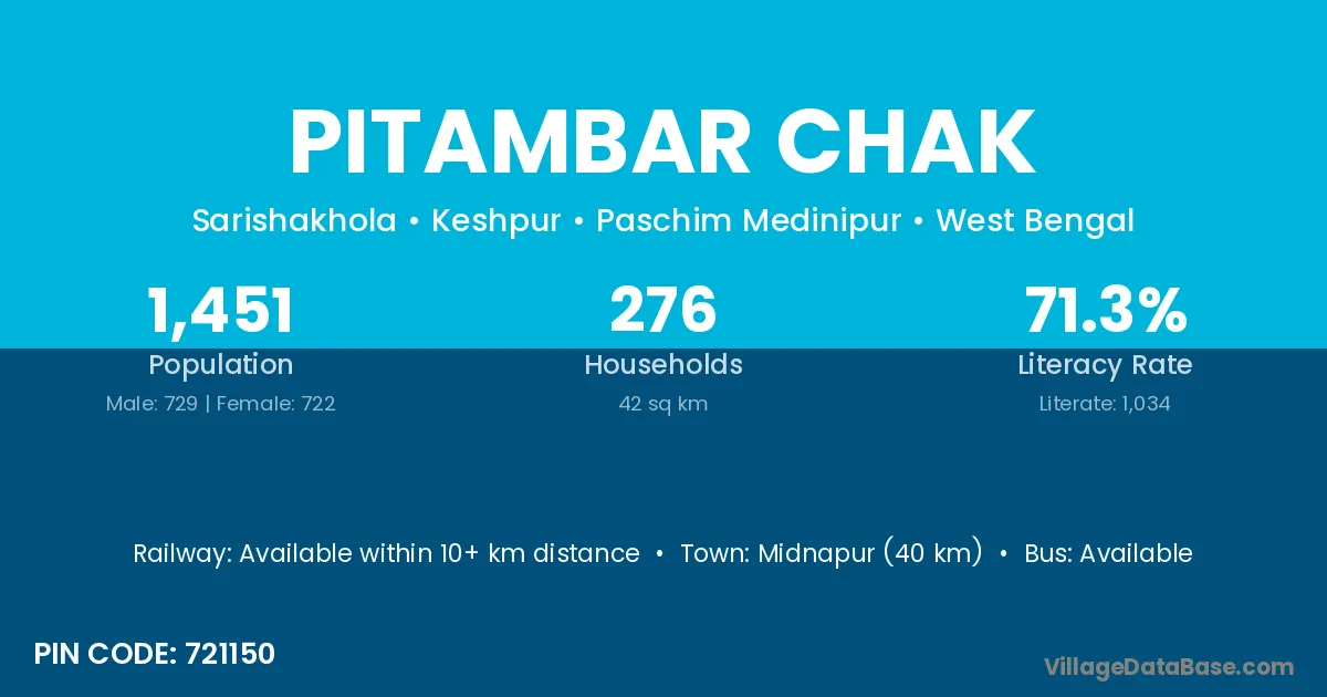 Midnapur (40 km) is the nearest town to Pitambar Chak village for major economic activities and is located approximately 40 km away.